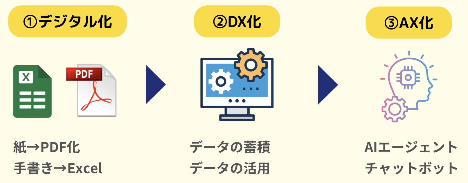 AIを活用するには、デジタル化 → DX化 → AX化という順番で進めていく必要があって、デジタル化やDX化なくしてAIを活用することはできないです。
