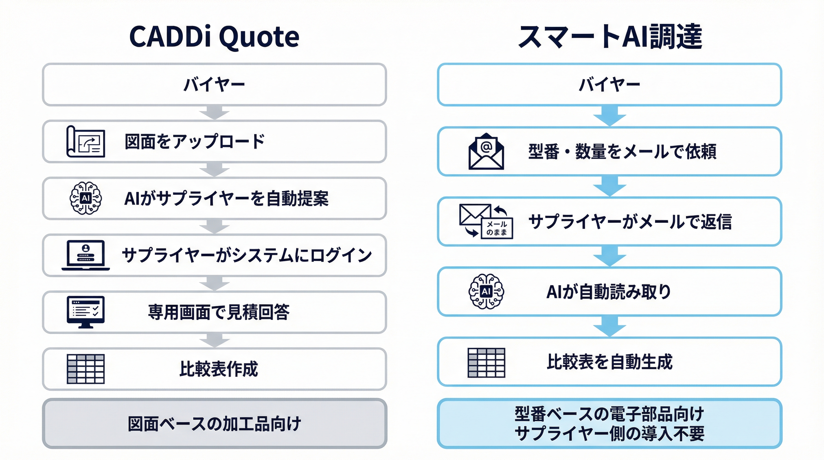 対象品目 | 加工品(板金・切削・樹脂等) | 電子部品(IC・コネクタ・受動部品等) |